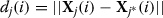 The initial distance from the j th point to its nearest neighbor, denoted as d j (0), is defined using the Euclidean norm as